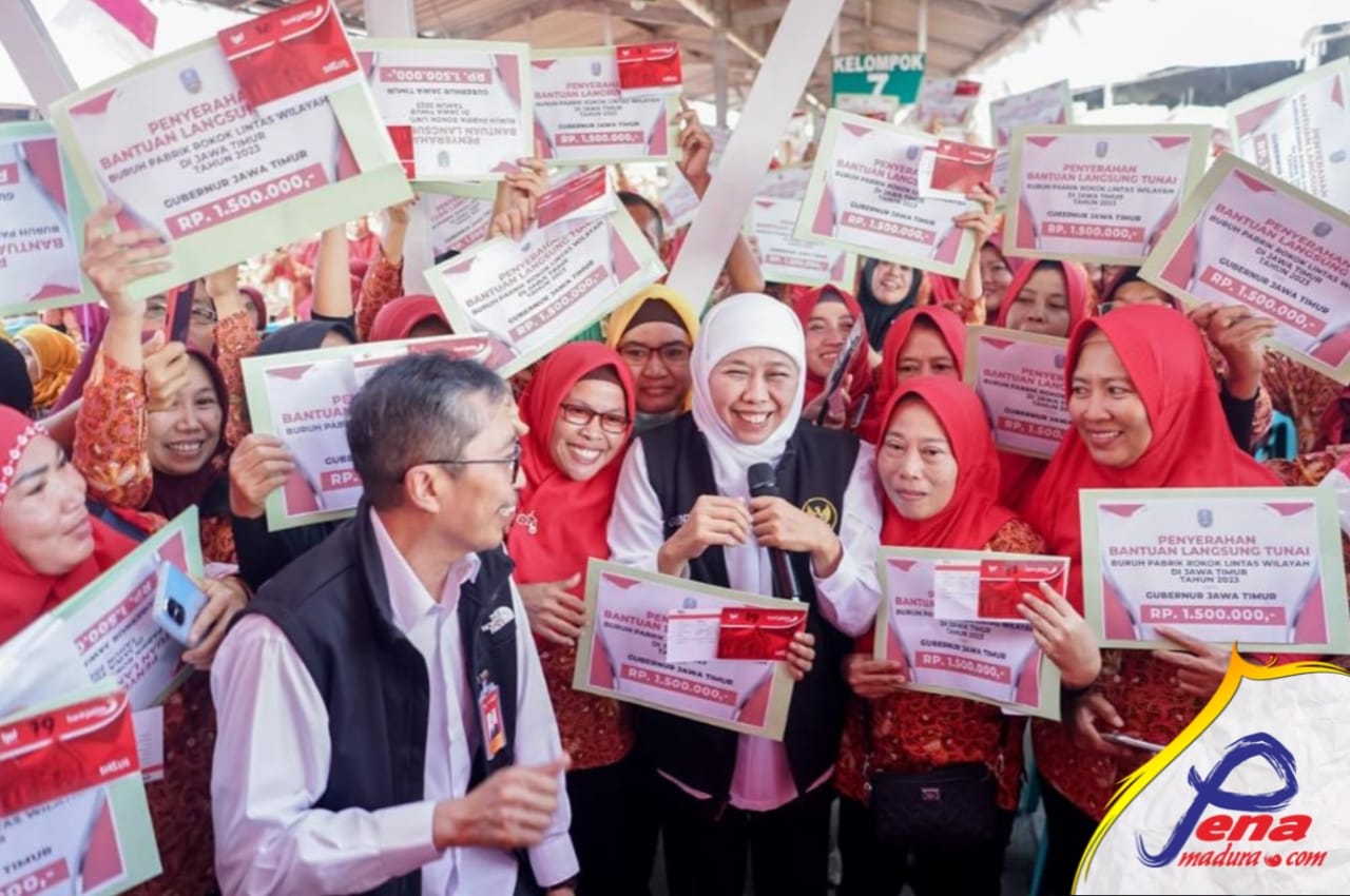 Pena Madura, Regional, 25 Agustus 2023 – Gubernur Jawa Timur Khofifah Indar Parawansa menyerahkan Bantuan Langsung Tunai (BLT) kepada 5.030 buruh pabrik rokok di Jatim, bertempat di PT. HM Sampoerna Rungkut 2, Surabaya, Kamis (24/8/2023). BLT tersebut berasal dari Dana Bagi Hasil Cukai Hasil Tembakau (DBHCHT) yang dikelola Pemerintah Provinsi Jawa Timur.