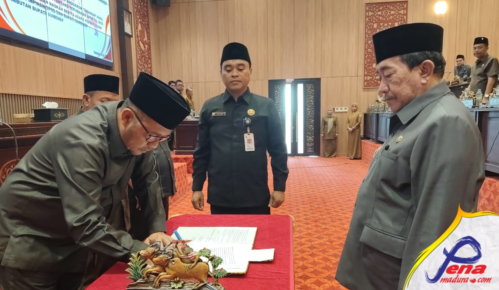 RRapatyang digalar di Graha Paripurna Gedung DPRD Sumenep, Senin 14 Juli 2025 itu berlangsung tertib dan lancar, diakhiri dengan penandatanganan persetujuan bersama oleh Wakil Bupati Sumenep KH. Imam Hasyim dan para Pimpinan DPRD.
