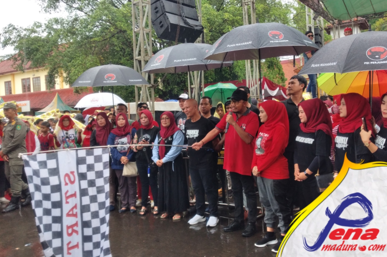 Said Abdullah (ketua DPD PDI Perjuangan jatim) bersama Bupati Achmad Fauzi (ketua DPC PDI Perjuangan Sumenep) bersama ribuan relawan mengikuti jalan-jalan santai dengan start dan finish di depan Museum keraton Sumenep kelurahan pajagalan.