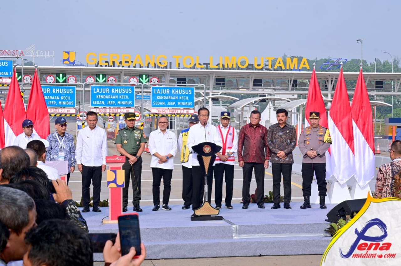 Pena Madura, Nasional, 08 Januari 2024 – Presiden Joko Widodo meresmikan jalan tol Pamulang-Cinere-Raya Bogor yang digelar di Gerbang Tol Limo Utara, Kota Depok, Provinsi Jawa Barat, pada Senin, 8 Januari 2024. Presiden menyebut jalan tol tersebut memiliki total panjang 14,8 km dengan total investasi sebesar Rp4 triliun.