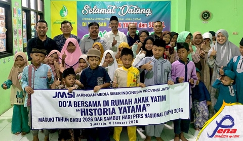 Pena Madura, Surabaya, 09 Januari 2026 – Mengawali tahun 2026 sekaligus menyambut peringatan Hari Pers Nasional (HPN) 2026, Jaringan Media Siber Indonesia (JMSI) Provinsi Jawa Timur menggelar doa bersama di Rumah Anak Yatim Historia Yatama, Kecamatan Waru, Kabupaten Sidoarjo, Kamis (8/1/2026).