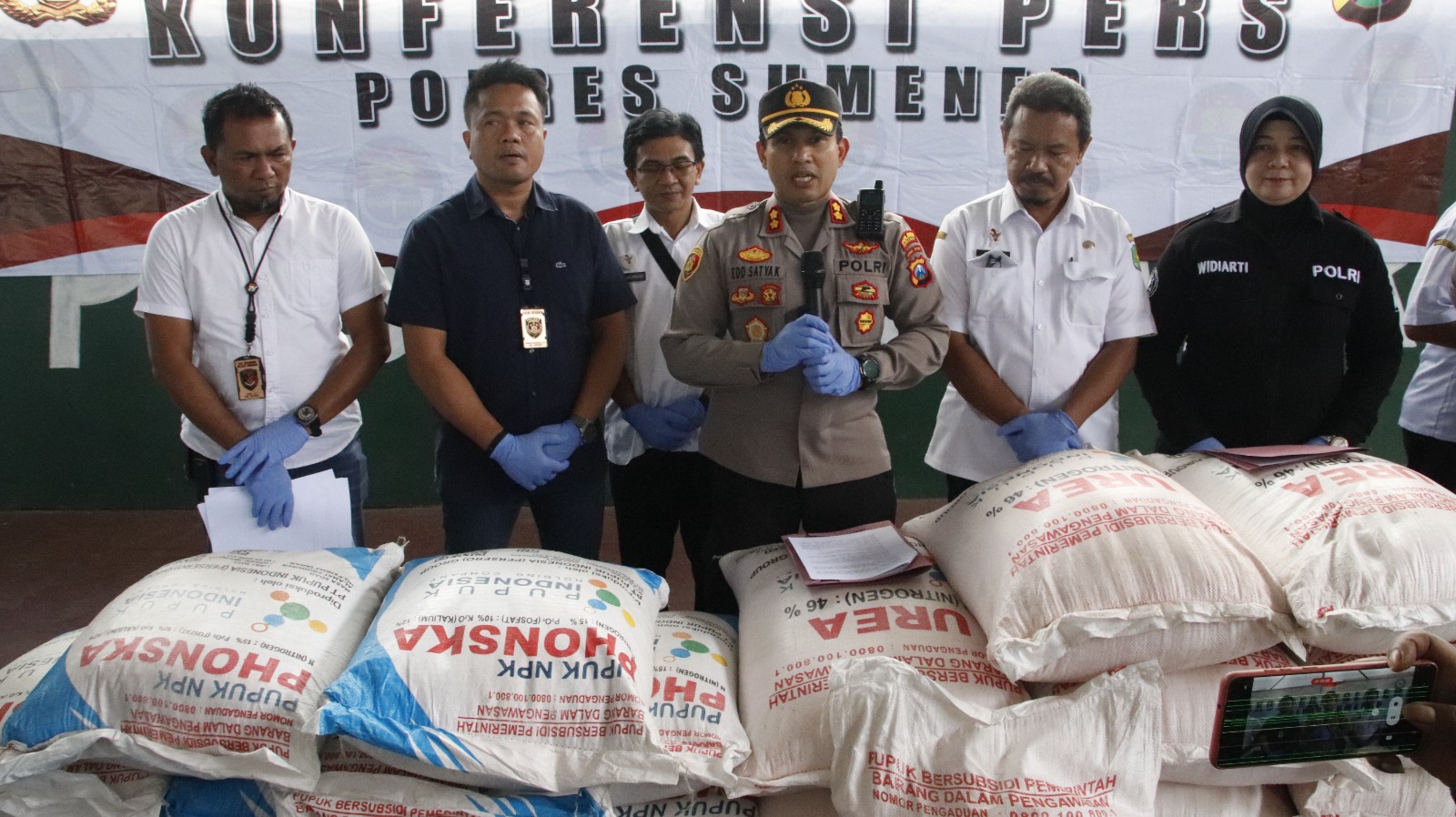 “Barang bukti pupuk sebanyak 2 truk, dengan rincian pupuk Urea 240 karung dan Phonska 120 karung. Saat ini 2 sopir kami amankan di Mapolres Sumenep guna penyidikan lebih lanjut. Sedangkan pelaku W pemilik barang kami tetapkan sebagai Daftar Pencarian Orang (DPO),” tutur Kapolres Edo.