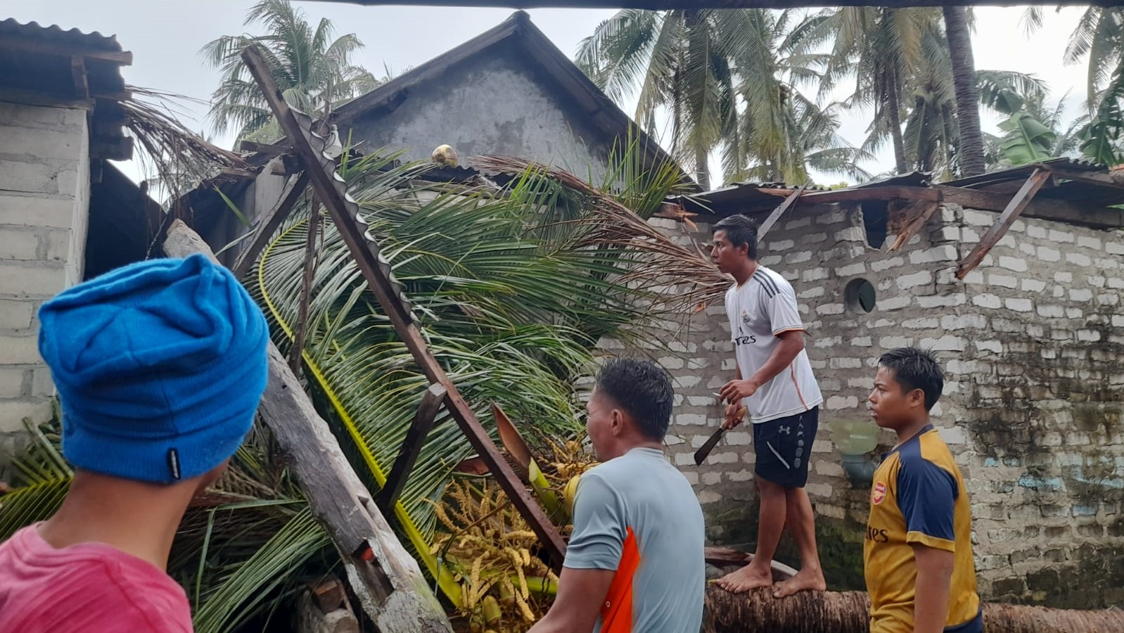 “awalnya tadi ada angin terus warga keluar rumah, tiba-tiba atap-atap rumah berterbangan dan satu pohon kelapa roboh,” kata Mirah, salah satu korban yang rumahnya rusak. Sabtu (26/02/2022).
