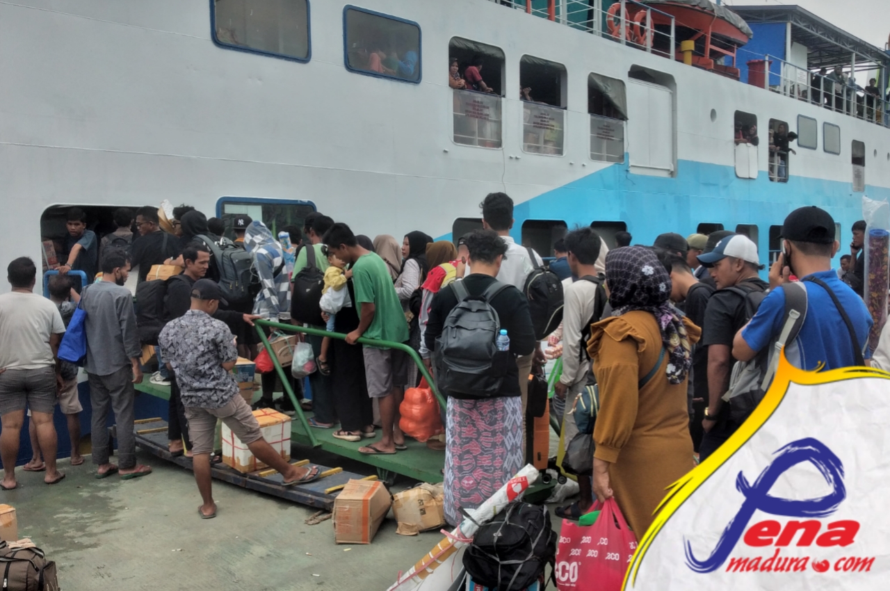 Ratusan calon penumpang antri berdesakan di depan tangga kapal Kmp. Monggityango Hulalo di Pelabuhan Kalianget Sumenep. Para penumpang yan sebagian besar merupakan para mahasiswa mengaku sengaja pulang kampung karena ingin mengikuti pemilu presiden dan legislatif 2024.